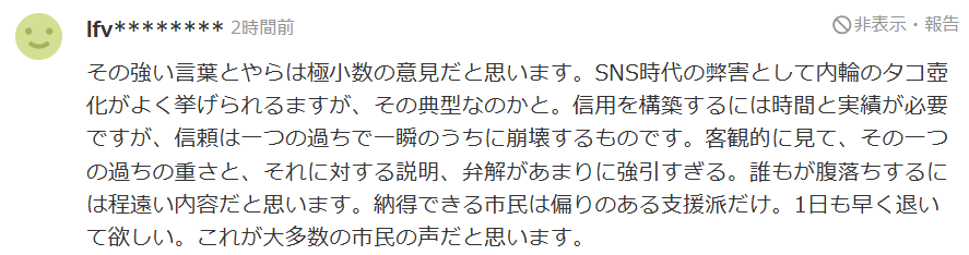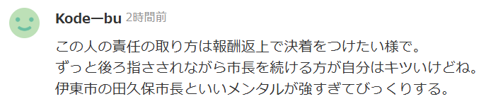 選挙の時の公約を一日でも早く果たしてほしいという市民の強い言葉をいただき、ここで退くのではなく、掲げた公約を実現することが私に課せられた責任であると、改めて職責の重さを感じるに至りました。市長としての道義的責任を明確にするため、自らの報酬の一部削減を含む処分案については、報酬の50%の削減を議会にお伝えさせていただきました