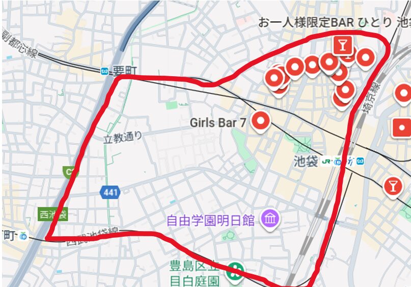 この赤枠のエリアに、三枝珠莉亜容疑者の勤務先のガールズバーがあると考えられます。