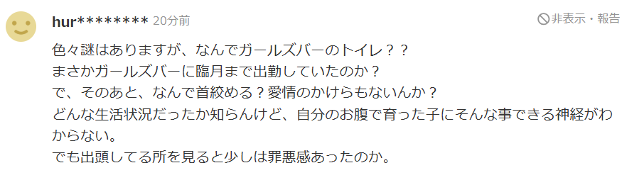 三枝珠莉亜容疑者はガールズバーのトイレで赤ちゃんを出産し、その場で首を絞めて殺害した疑いが持たれています。