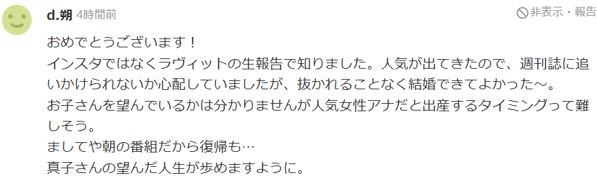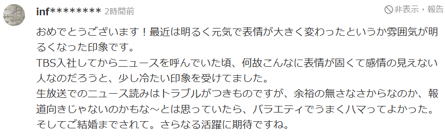 「好きな女性アナウンサーランキング」1位に輝いた経験を持つ田村真子アナですから、世間に与えた衝撃も大きいようです。