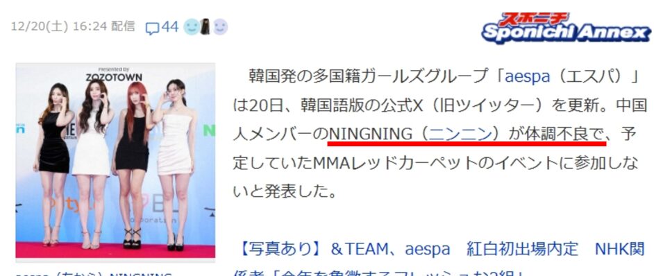- 【aespa】ニンニンがインフルエンザで紅白歌合戦を辞退