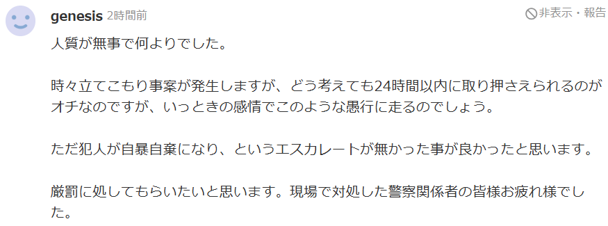 | 特記事項 | 現場で警察が説得を続け、約14時間後に逮捕された | |